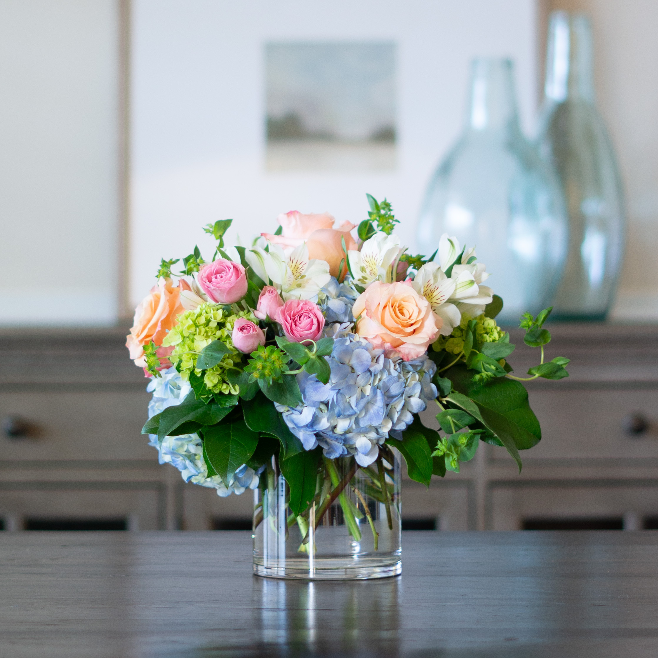 A low, lush bouquet of soft pink and white blooms with pops of vibrant hot pink—bright, bubbly, and as refreshing as a glass of pink lemonade on a sunny day.