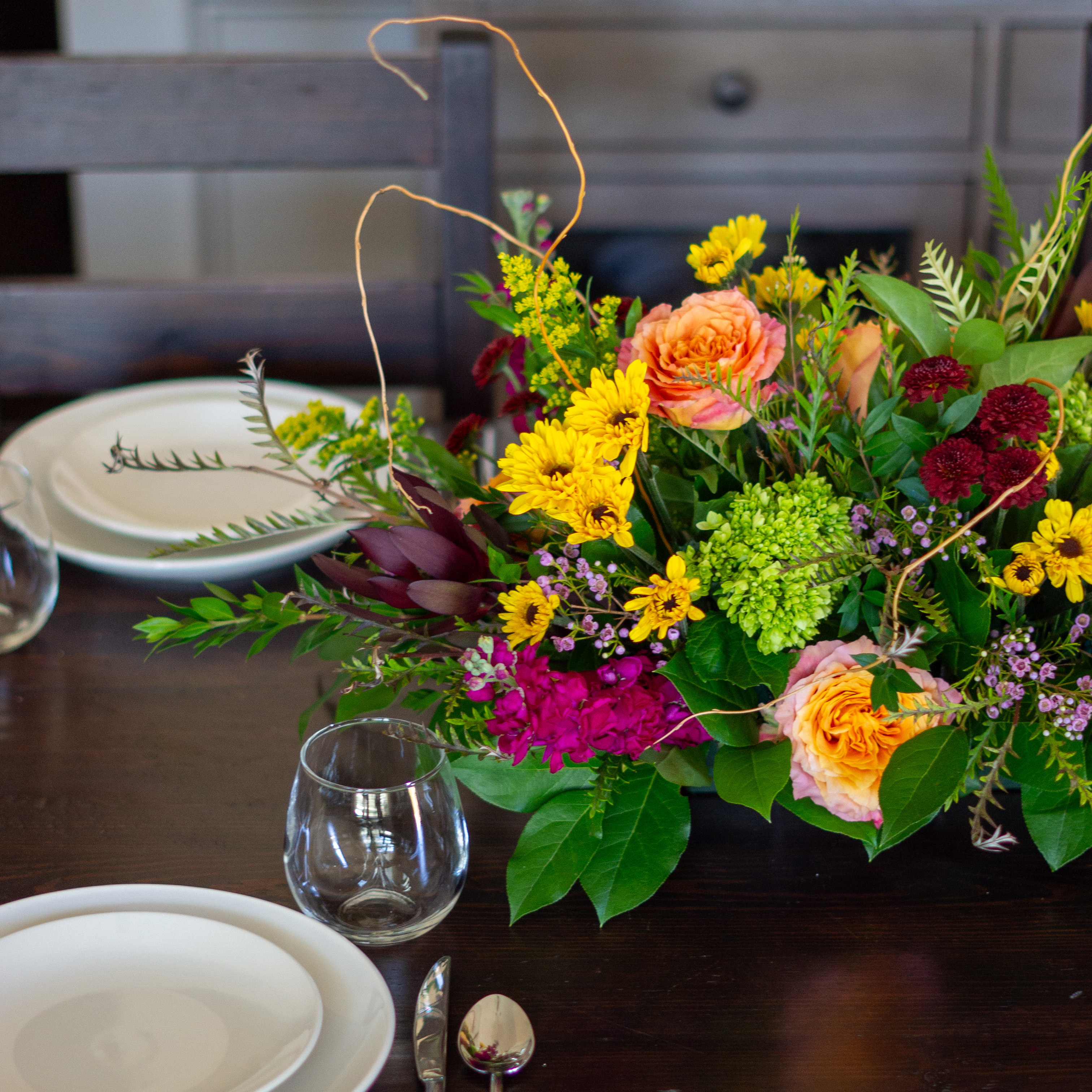 The Thanksgiving Garden Centerpiece celebrates the season with lush textures and vibrant fall hues. Designed in a long, meadow-style shape with a hidden container, it’s perfect for dining tables or buffets. Full of warmth, color, and natural charm, this arrangement brings effortless beauty to your Thanksgiving celebration.